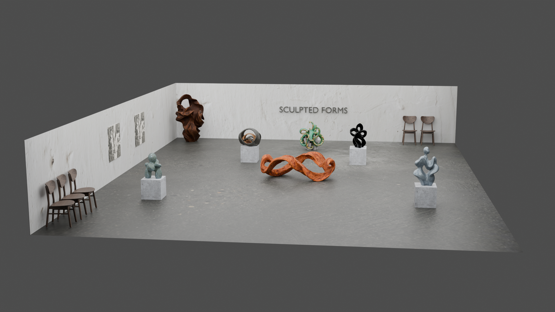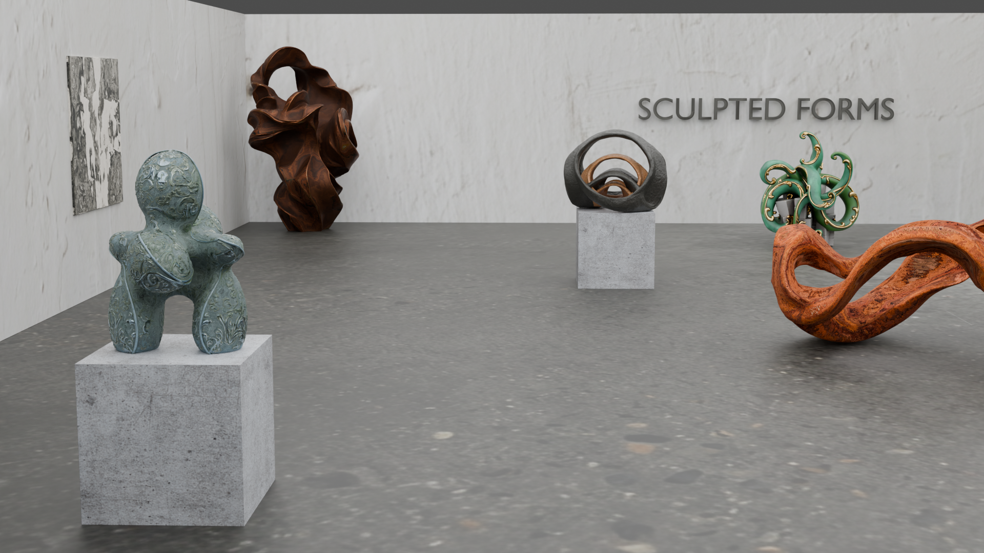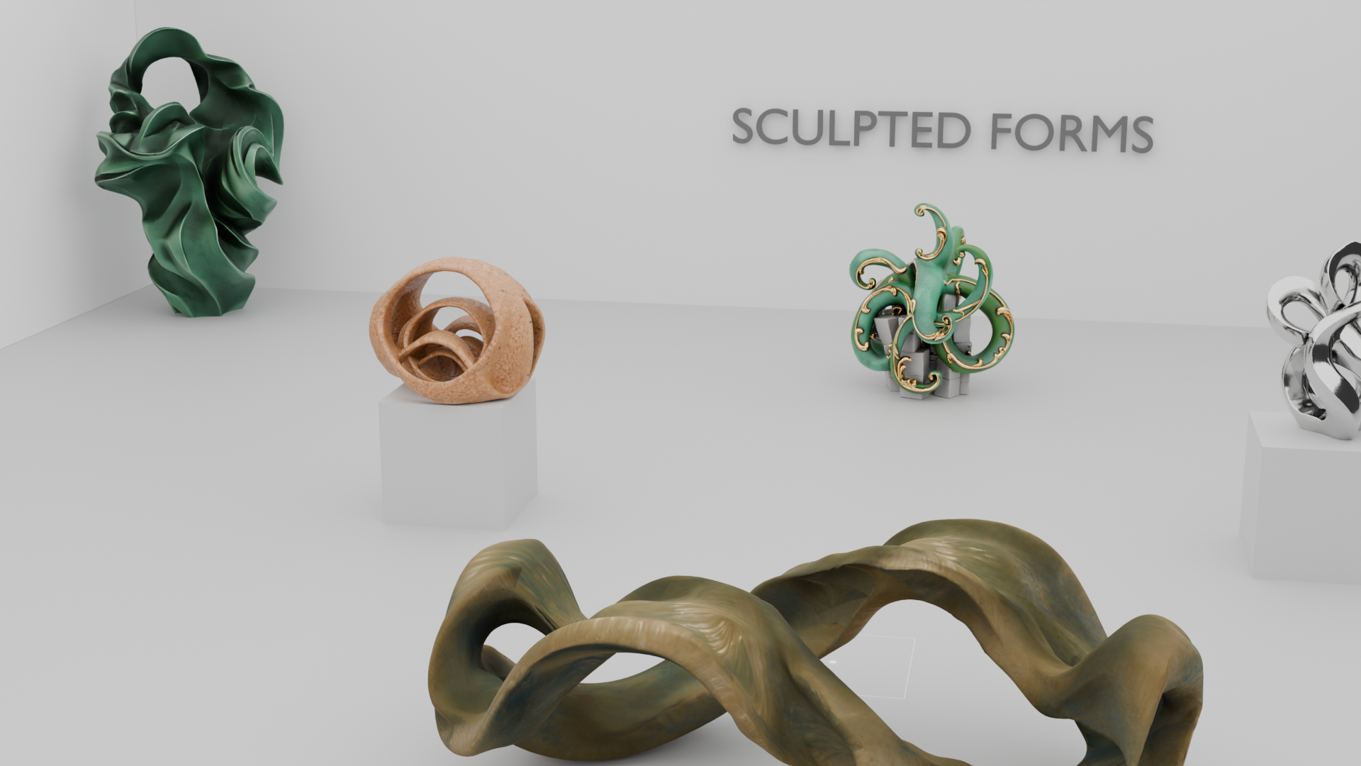 A gallery space created in Blender with 3D sculptures and objects created through AI.