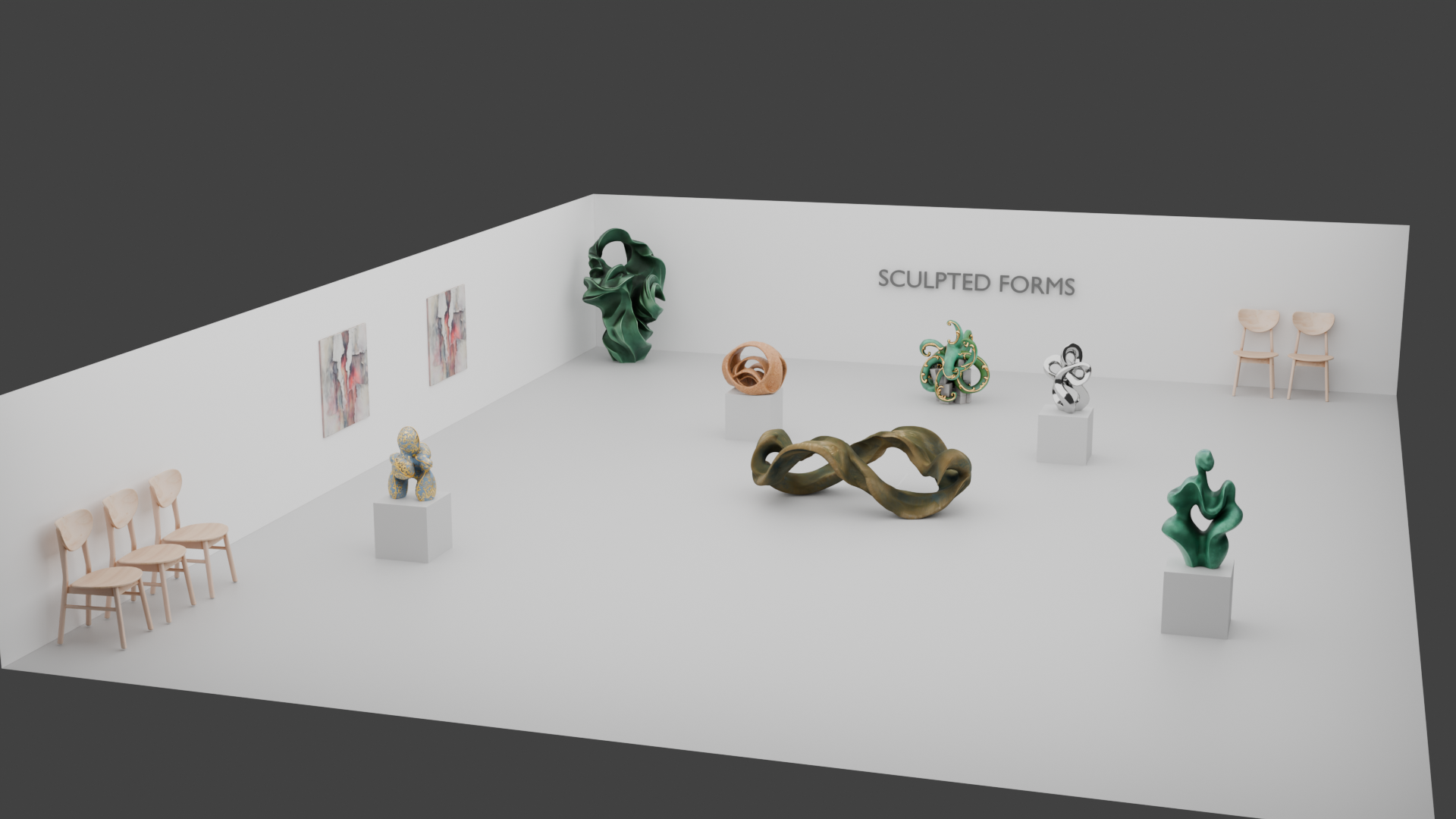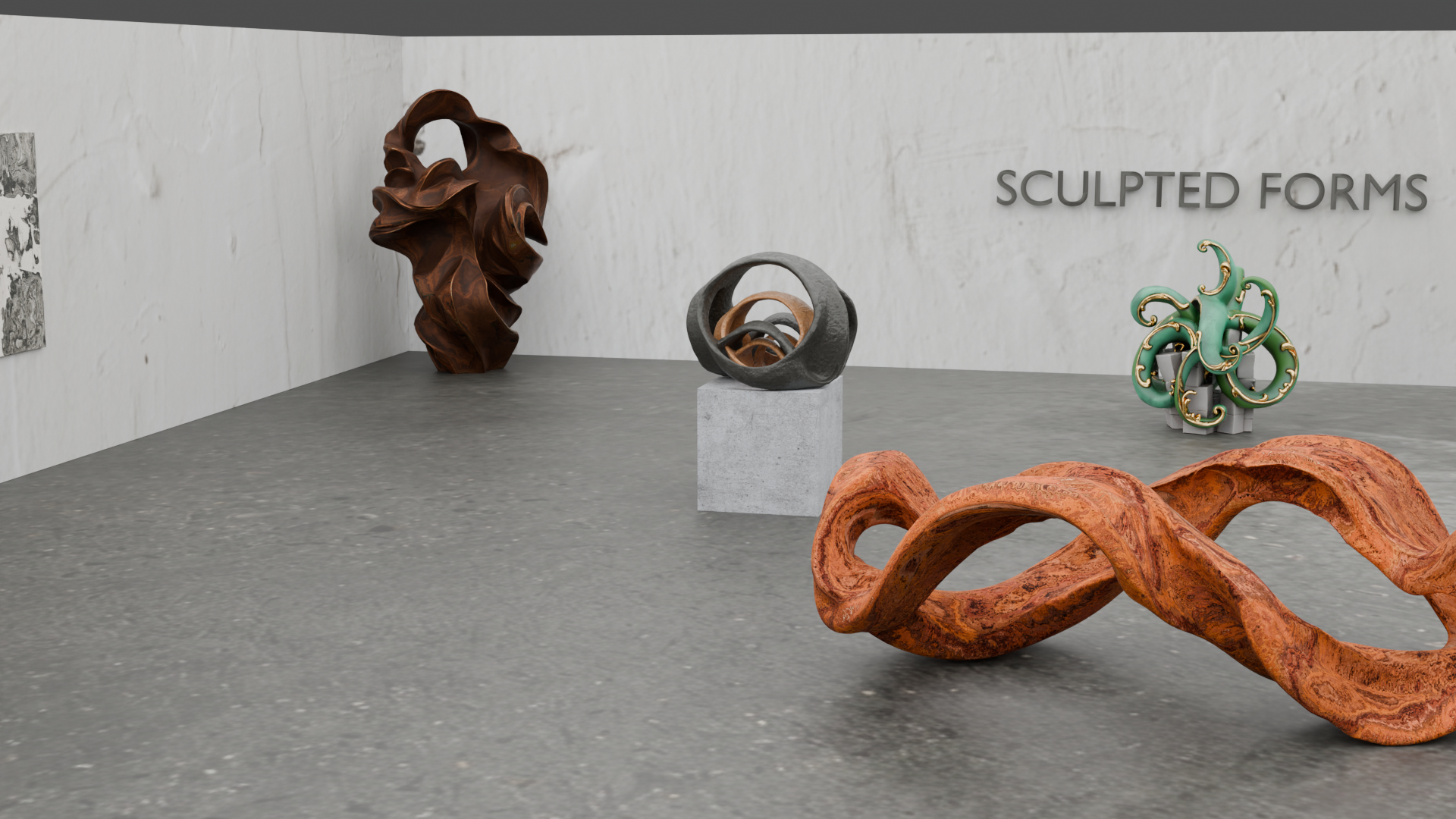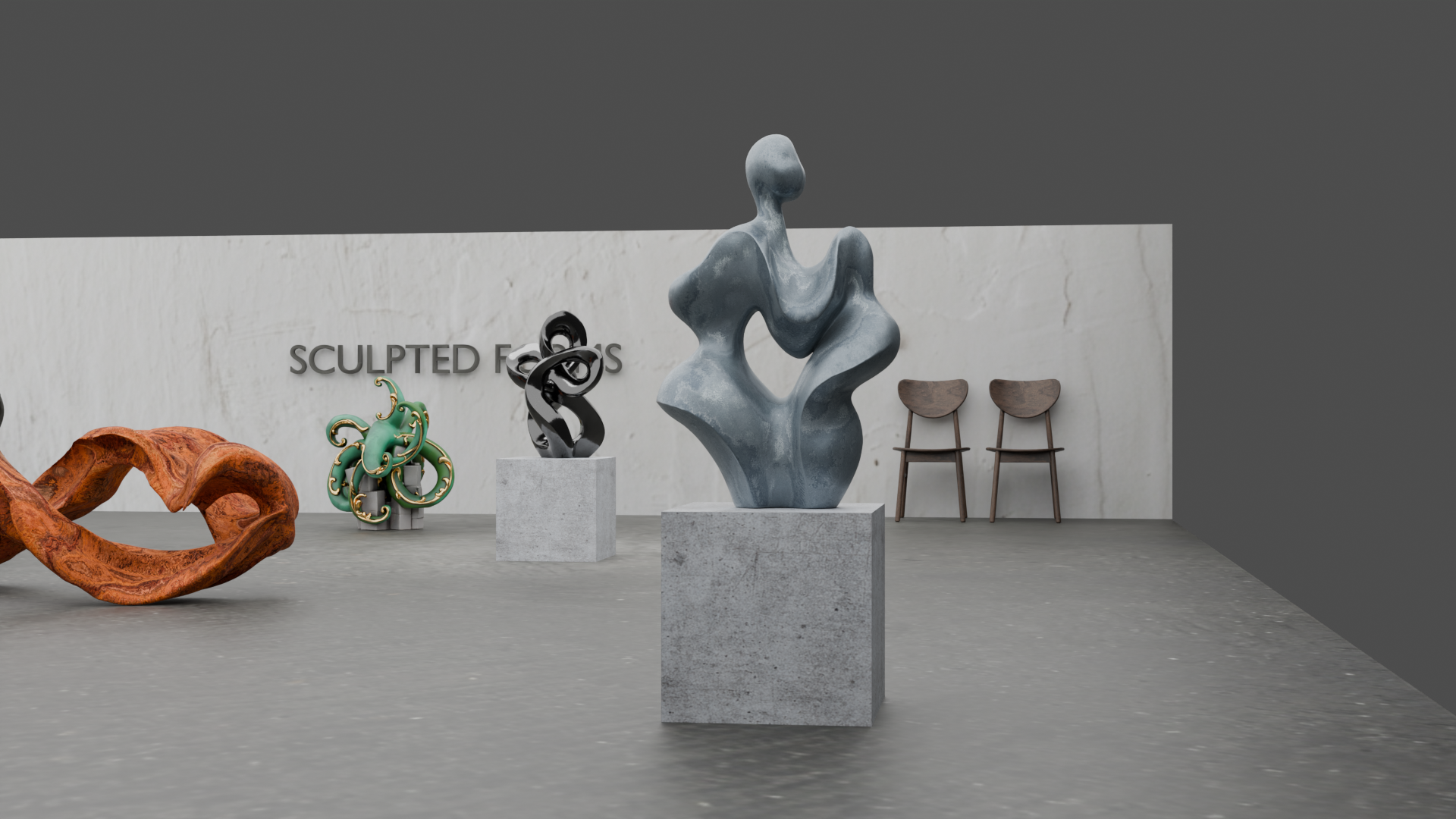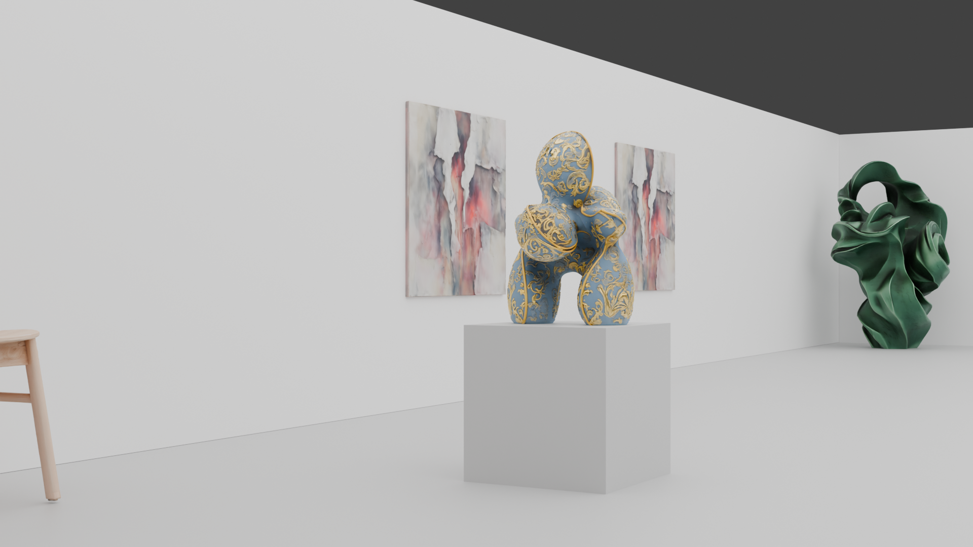 A gallery space created in Blender with 3D sculptures and objects created through AI.